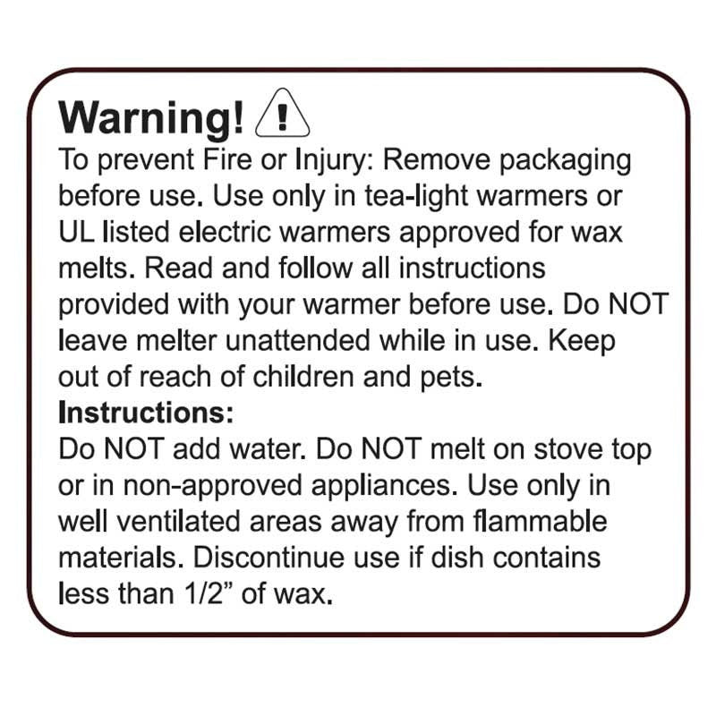 Use only in warmers approved for wax melts. Keep out of reach of children and pets. NOT edible. Do NOT add water. It is your responsibility to use your wax melts safely and responsibly.