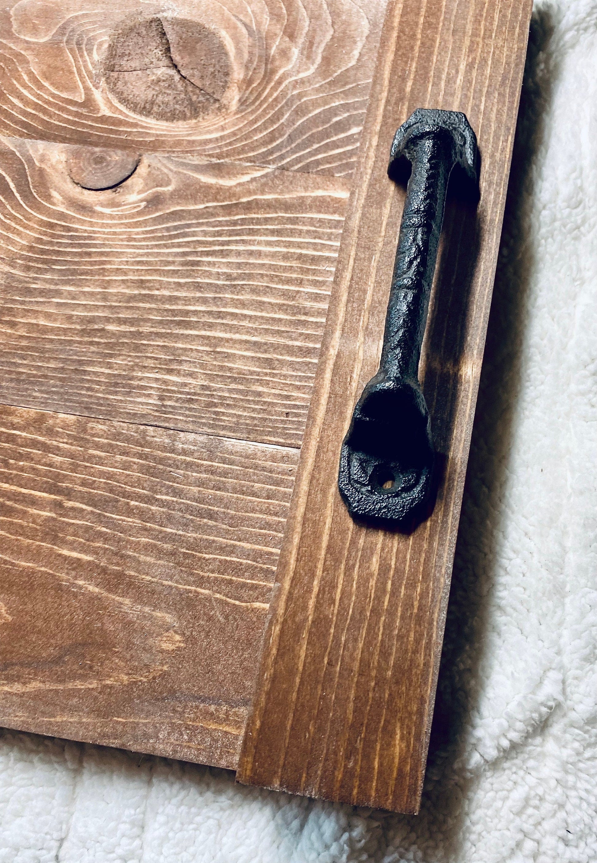 This handmade wooden serving tray makes a great addition to your kitchen, or use it on your coffee table or as an ottoman tray. The tray is made of solid pine wood and the photo shows a piece stained in a rich English Chestnut color. The design is burned into the wood, and it will not fade, chip or peel.