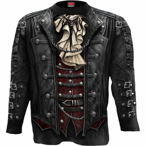 No Steam Punk biker should be without this. Realistic leather, laces & buckles with a metallic winged skull and cravat. This is Heavy Metal with a twist of Victorian elegance, and every bit the gothic Spiral masterpiece. Allover Longsleeve T-Shirt Black is made of Top Quality 100% Cotton, Interlock using skin friendly, Azo-free, Reactive dyes.