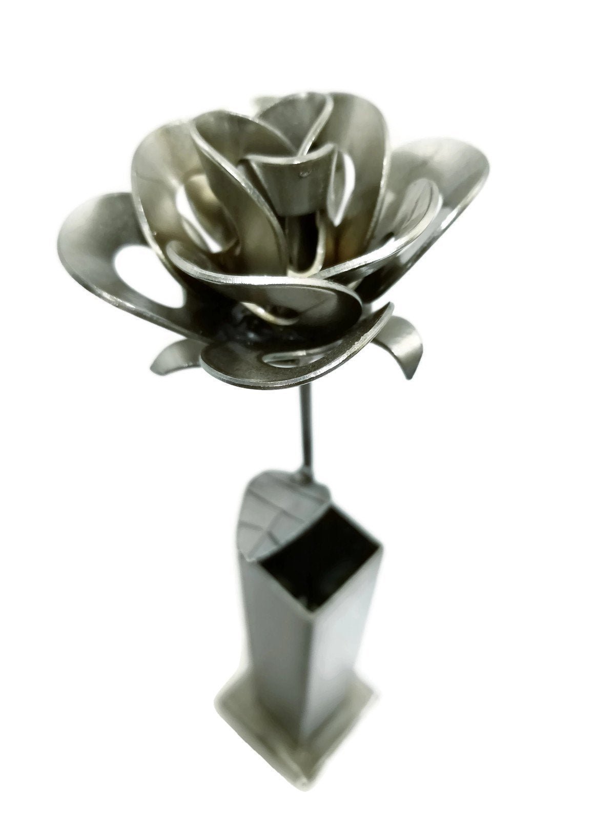 The handmade welded metal rose with a vase creates the perfect gift. This is one of our up-cycled roses and a vase made from recycled materials including washers, tubing, and wire welded together creating beautiful art. Each rose is an individual and a little different all created from the same materials. The washers are all hand bent and welded together to create a beautiful welded art rose that will never die. This gift would be great for Weddings, Anniversaries, Valentine's Day or just a great way to say you are sorry. Please keep in mind this is for one rose and one vase. They will differ slightly from the image as each one is handcrafted depending on the availability of similar components creating the same size result and similar looking product. Included will be a tag attached to the rose with jute cord. Every one of our items is cleaned up to have the sharp edges removed. They are then sprayed with a clear lacquer to give a continuous shine and prevent any type of rust.