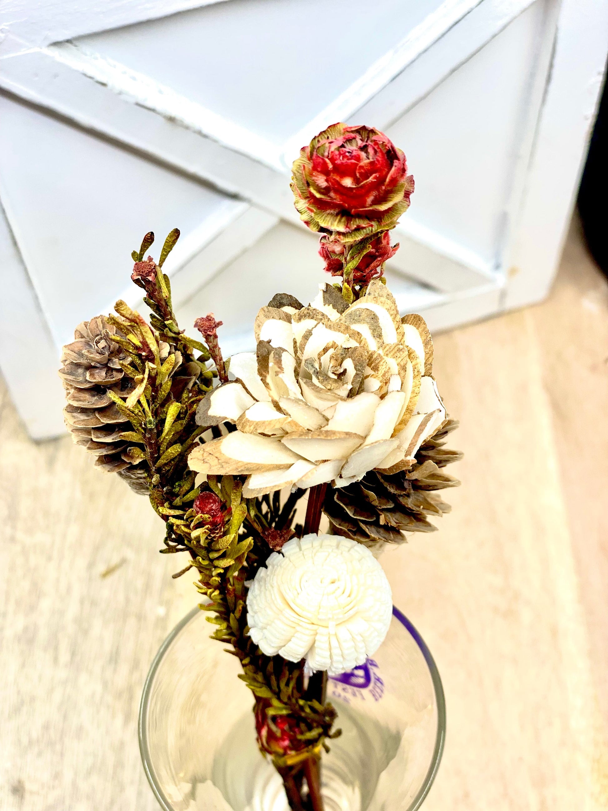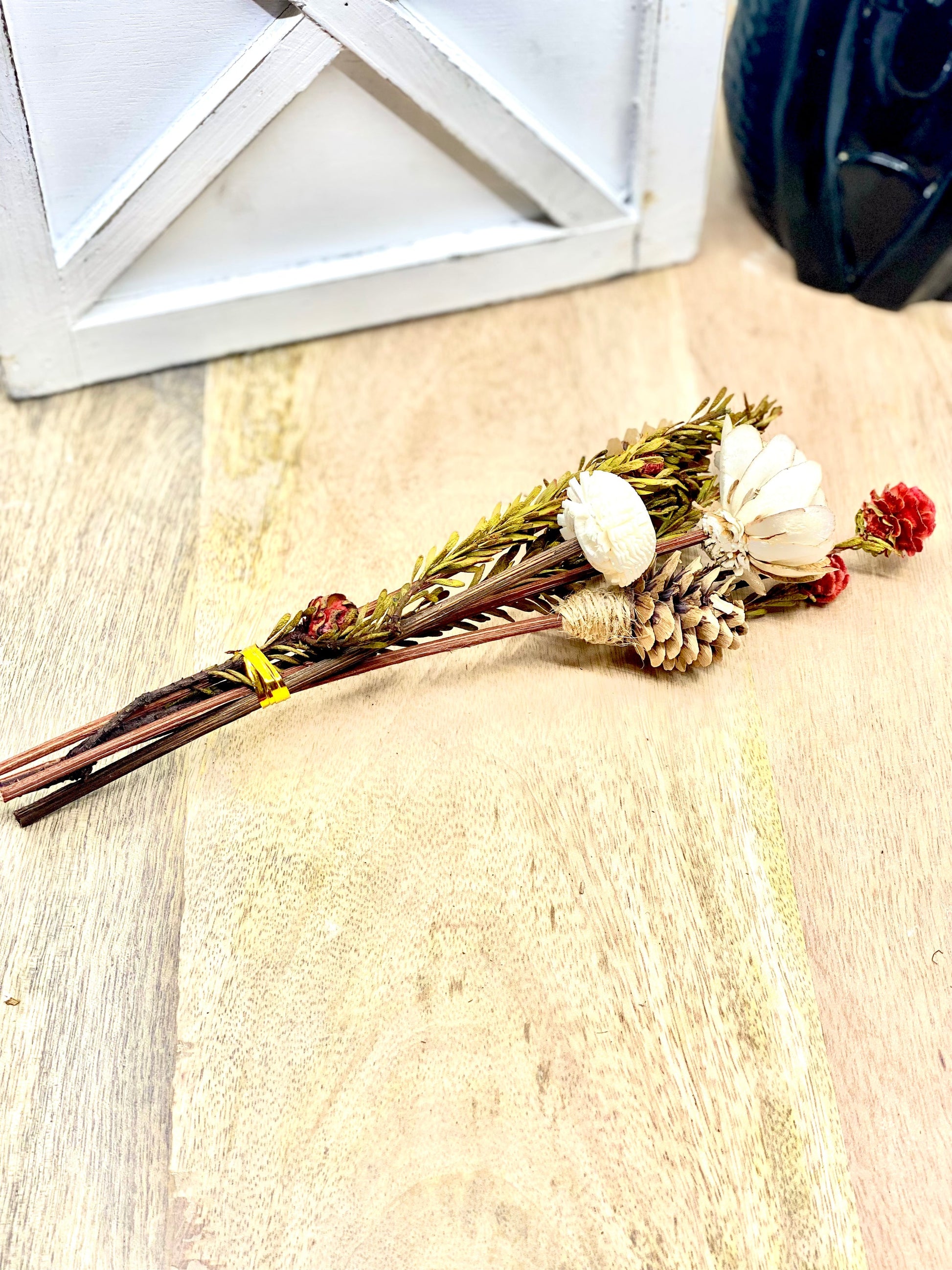 Each Reed stick bundle contains, dried plants and flowers paired with rattan wood flowers. Bundles have 2 mini pine cones , red tortum, 2 rattan wood flower.