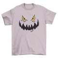 Cool Halloween theme t-shirt design featuring carved evil grinning pumpkin face in orange color.