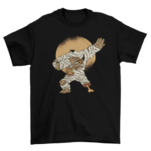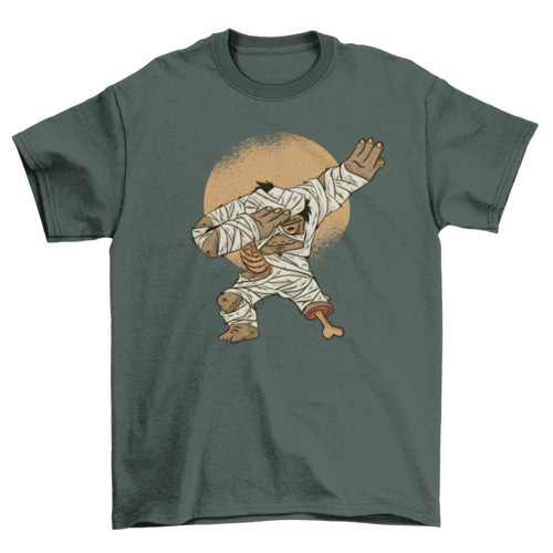 Cool Halloween cartoon t-shirt design featuring zombie mummy doing dab dance move over full moon background.