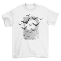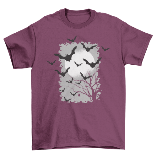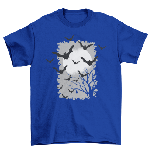 Cool Halloween t-shirt design featuring plenty of bats silhouettes flying over spooky tree full moon night background.