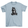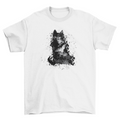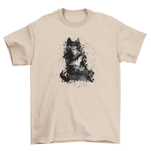 Cool Halloween theme t-shirt design featuring grungy watercolor paint cat and bat silhouette with paint splashes around. Suitable for tee and other prints