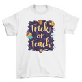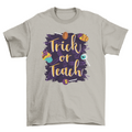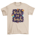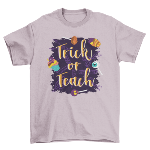 Trick or Teach Halloween School T-shirt Design with the phrase TRICK OR TEACH and some Halloween sweets with school supply elements.