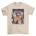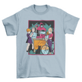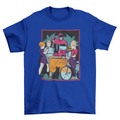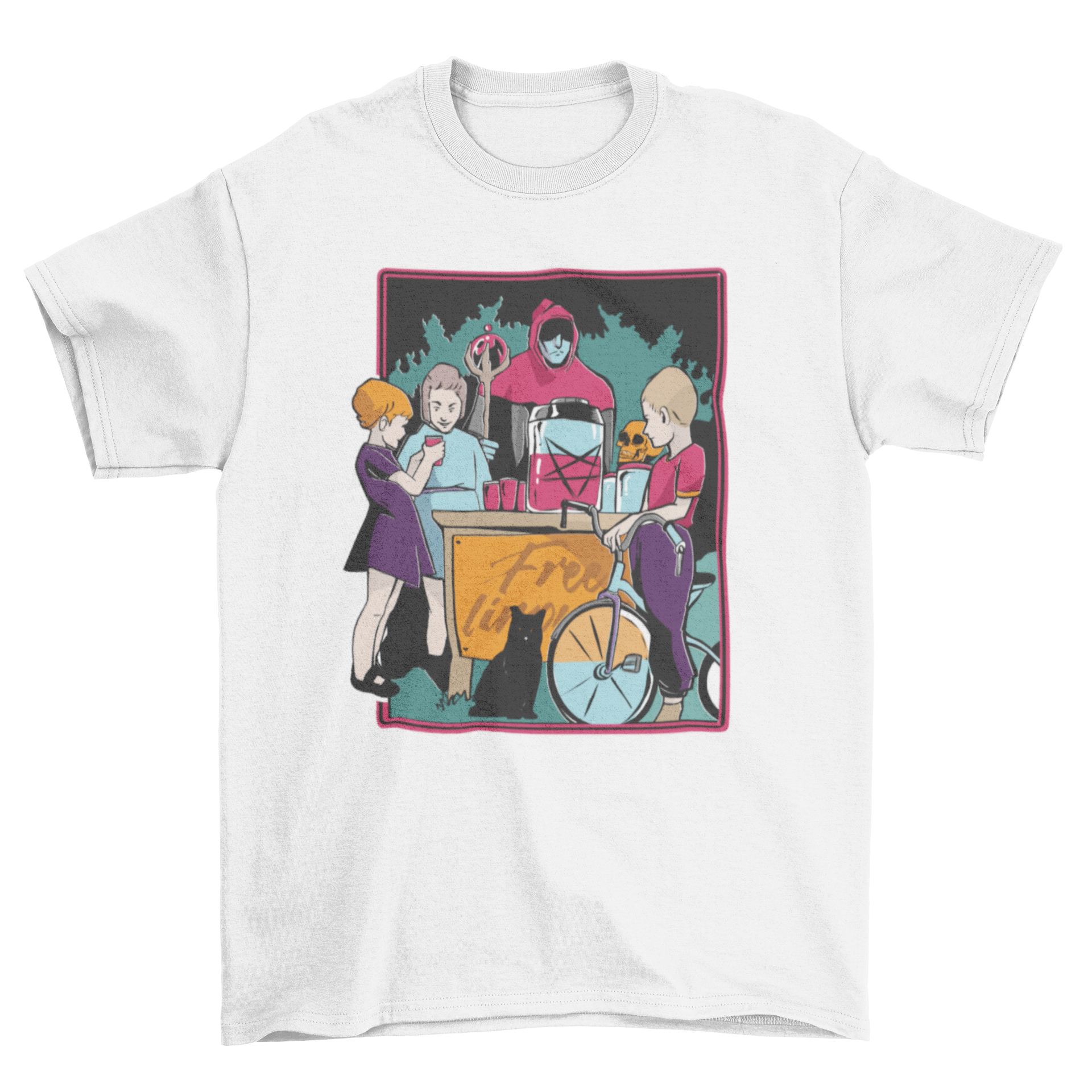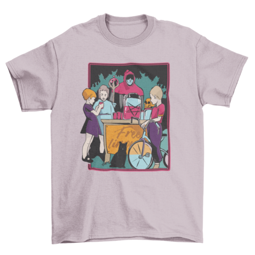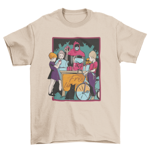 T-shirt design featuring a group of kids gathering around getting a free drink with a person that appears to be the cult leader wearing a red hood.