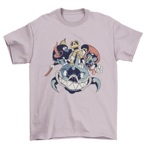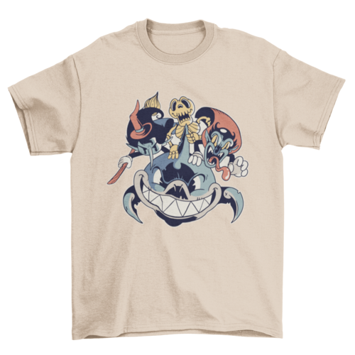 Halloween Friends T-Shirt Design featuring an illustration of a shark a witch a skeleton and a vampire in a dark style.