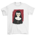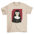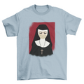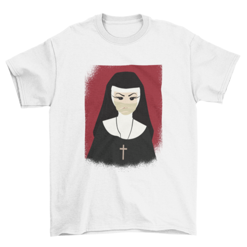 Halloween themed t-shirt design featuring an illustration of a fierce looking nun over a maroon background.