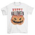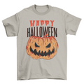 Spooky t-shirt design featuring an illustration of a bloody Jack o lantern with a creepy expression and â????Happy Halloweenâ???? caption.