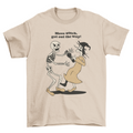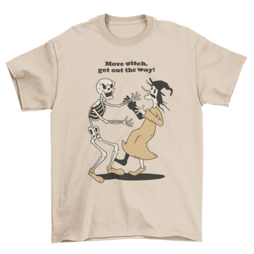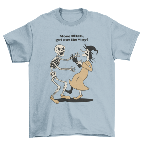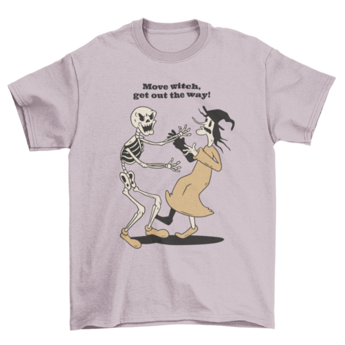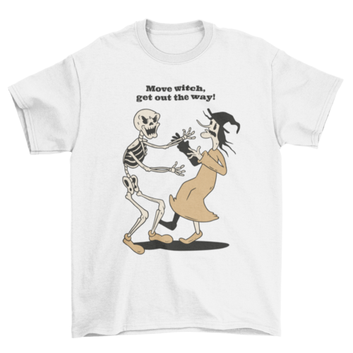 Funny Halloween t-shirt design featuring an illustration of a skeleton and a witch with "Move witch get out the way" caption.
