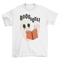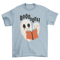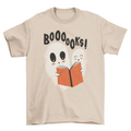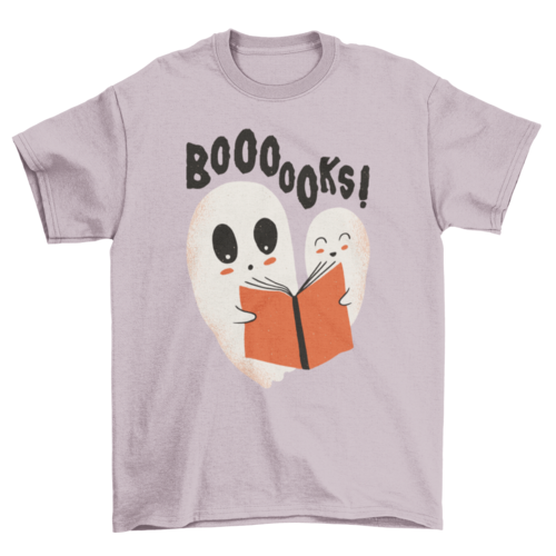 Funny t-shirt design featuring an illustration of two ghosts reading a book with "Boooooks!" caption.