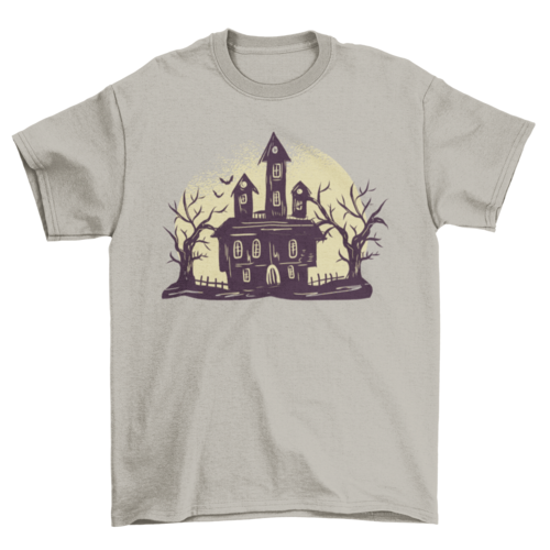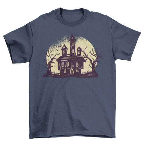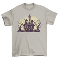 Cool Halloween theme t-shirt design featuring haunted house and spooky trees silhouette over full moon backdrop.