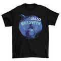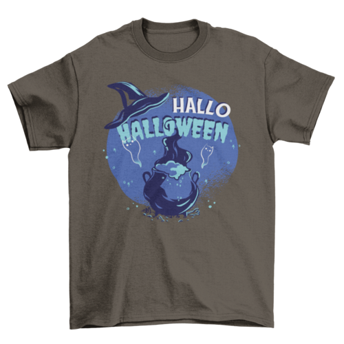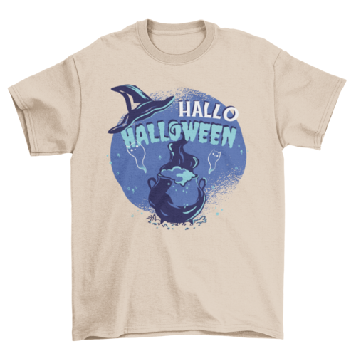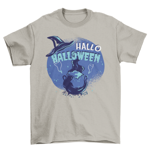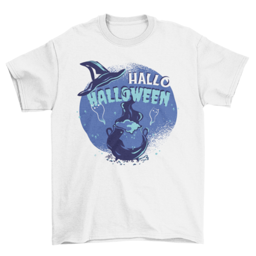Scary t-shirt design that features an illustration of a cauldron and a witch's hat next to the quote Hallo Halloween.