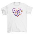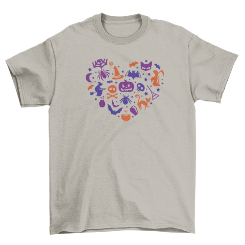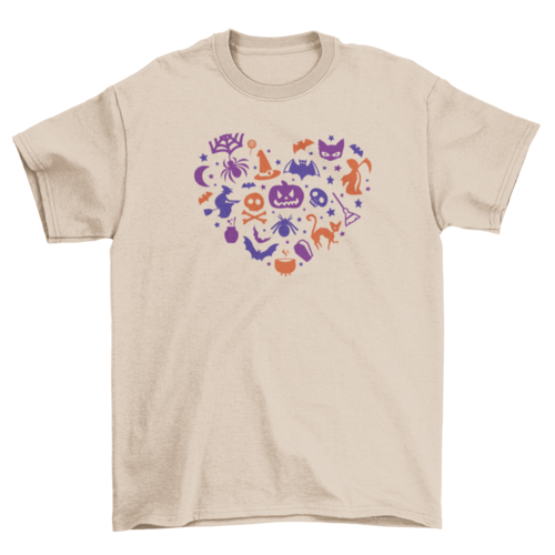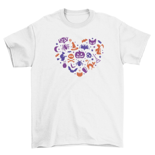 Cool t-shirt design that includes an illustration of a heart made of Halloween elements.