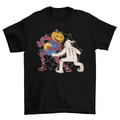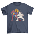 Cool Halloween t-shirt design featuring a pumpkin and a ghost playing basketball.