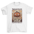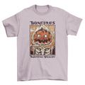 Creepy t-shirt design that includes an illustration of a pumpkin on fire with the quote "Bonfires burning bright".