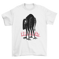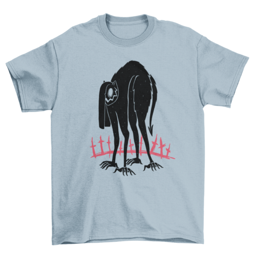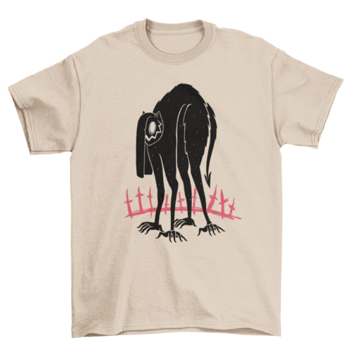Creepy t-shirt design featuring a demon black cat monster for halloween.