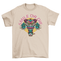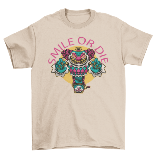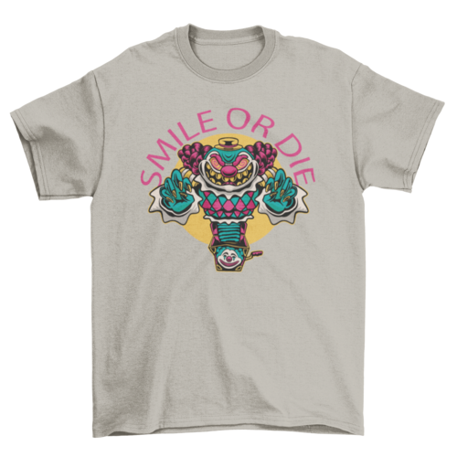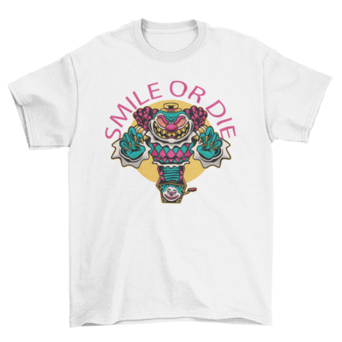 Great halloween t-shirt design featuring a toy clown with the quote "Smile or die".