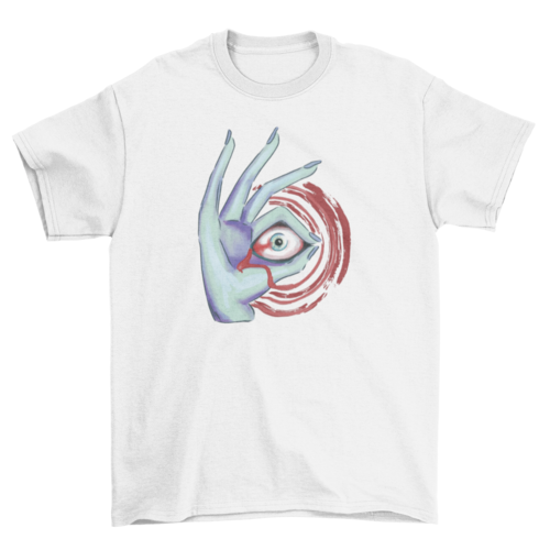 Scary t-shirt design that features a hand holding an eye bleeding into a spiral