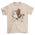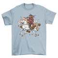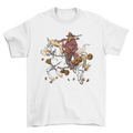 Amazing t-shirt design featuring a hunter creature riding a horse and carrying pumpkins.
