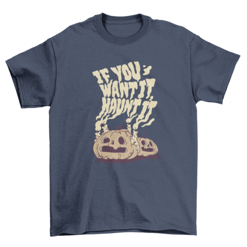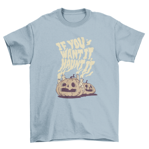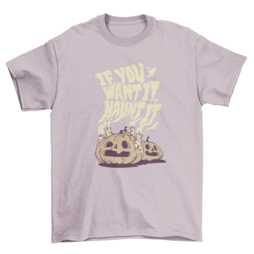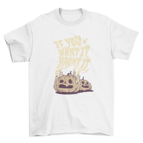 Cool t-shirt design featuring two carved pumpkins and the quote "If you want it, haunt it".