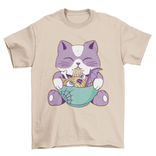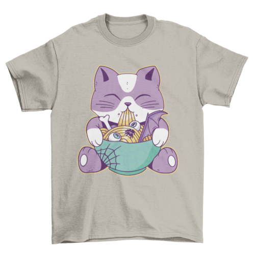 Cute t-shirt design of a cat eating a bowl of ramen noodles with scary ingredients such as eyeballs, bone and spider!