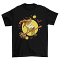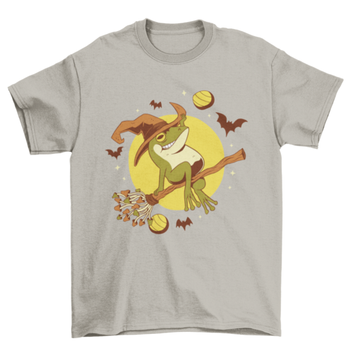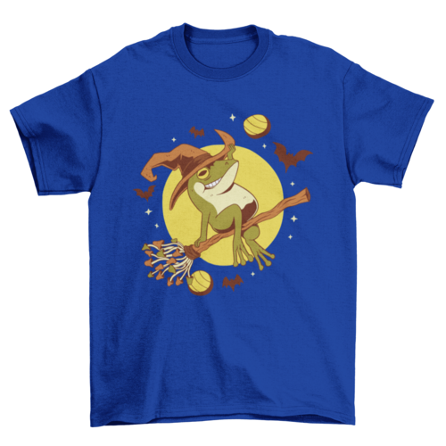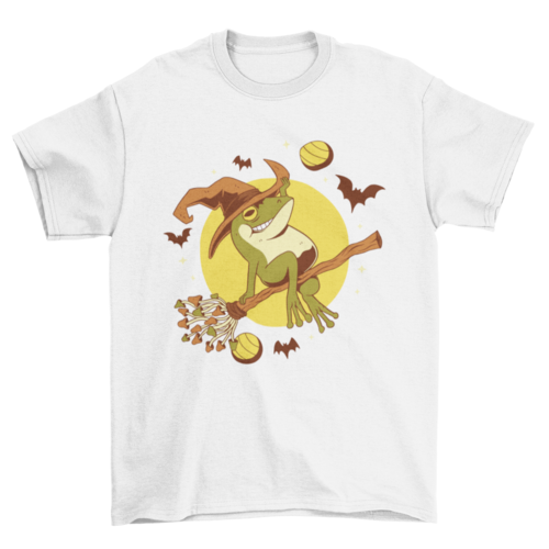 Amazing halloween t-shirt design featuring a frog flying with a broom.