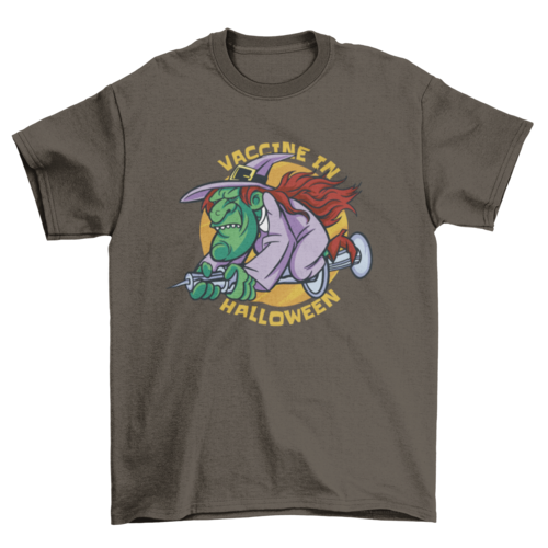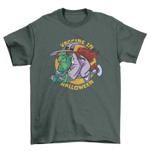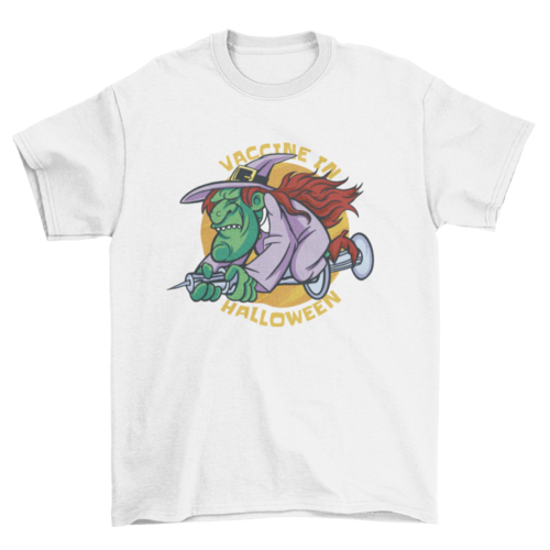 Cool vaccine t-shirt design of a witch flying on a syringe with the quote "Vaccine in halloween".
