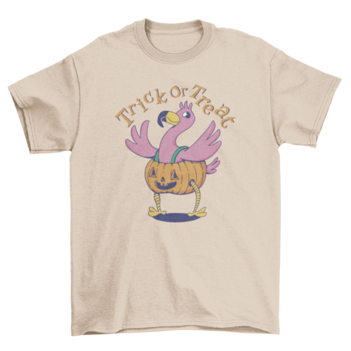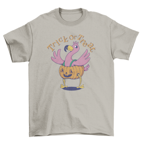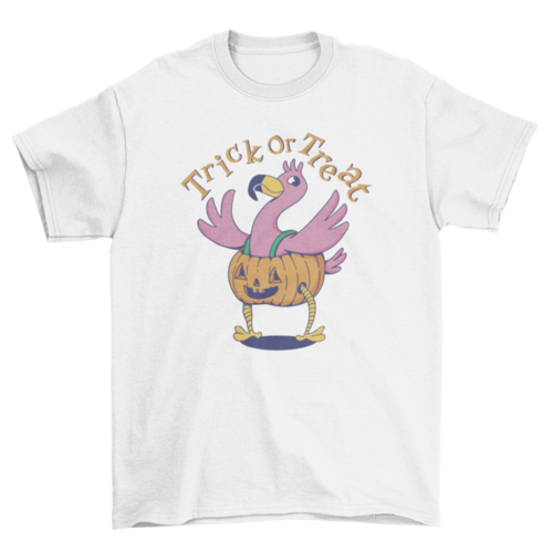 Cute halloween t-shirt design of a flamingo wearing a jack o' lantern costume with the quote "Trick or treat".