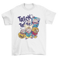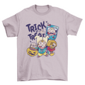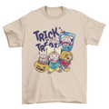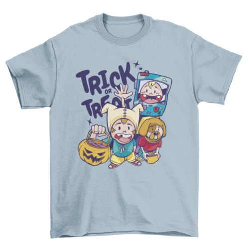 Fun t-shirt design that features three chidlren in halloween costumes with the quote "Trick or treat"