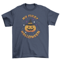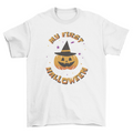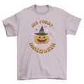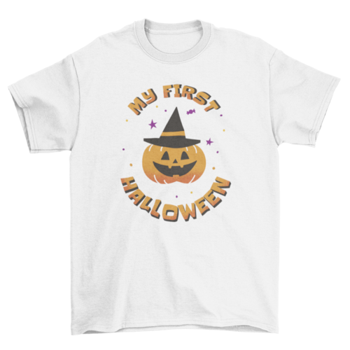 Lovely t-shirt design featuring a jack o lantern with a witch's hat and the quote "My first halloween".