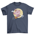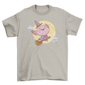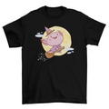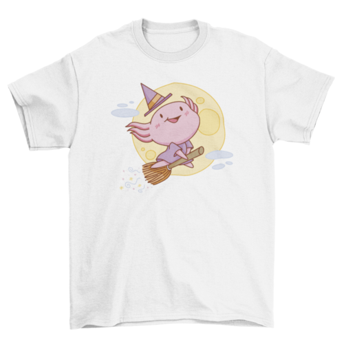 Super cute t-shirt design featuring a pink witch axolotl flying in broomstick.