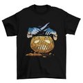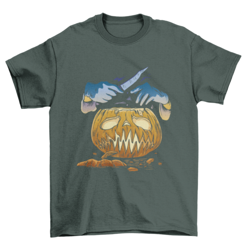 Nice t-shirt design featuring a halloween pumpkin with surgeon hands with knife in illustration style