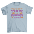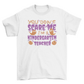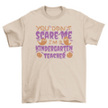 Funny t-shirt design featuring quote "You don't scare me I'm a kindergarten teacher" in flat style.