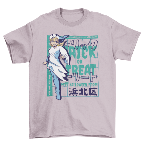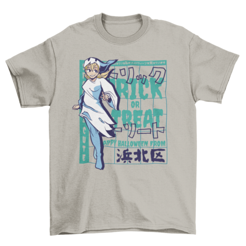 Great Halloween t-shirt design of an anime girl dressed as a ghost and the quote 'Trick or treat happy halloween'.