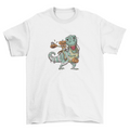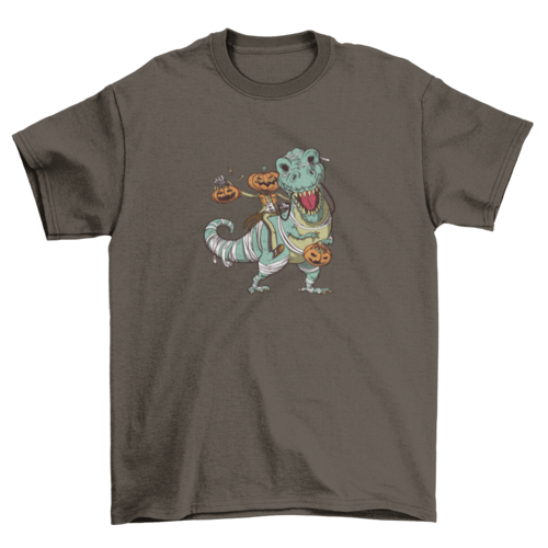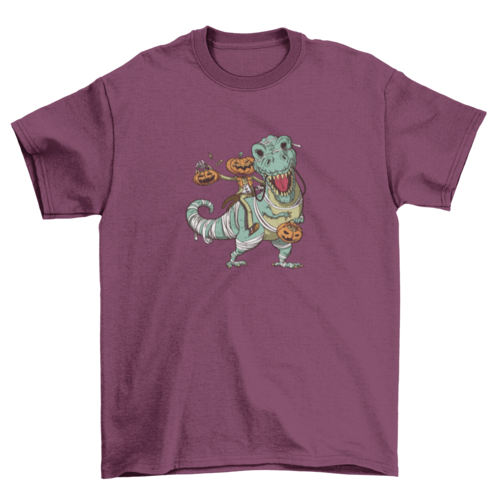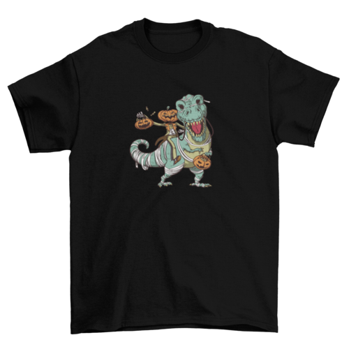 This great Halloween t-shirt design features a Jack O' Lantern riding a mummy-dressed t-rex.