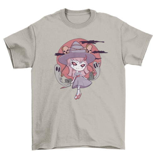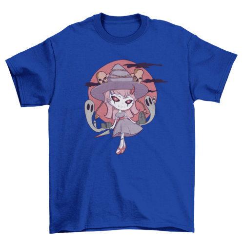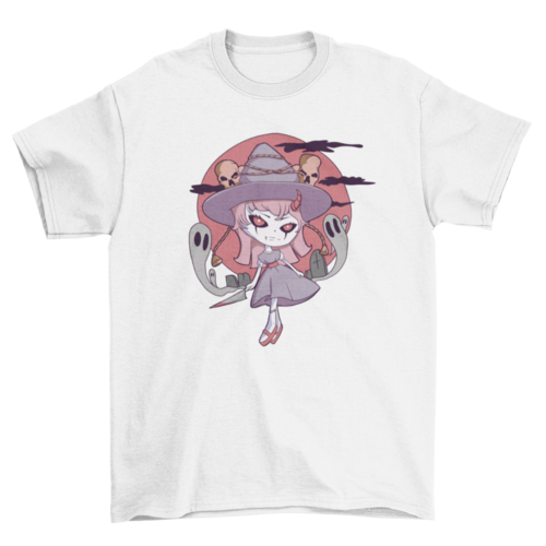 Amazing t-shirt featuring a creepy witch-doll in cartoon style