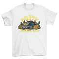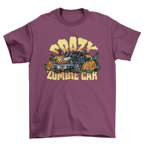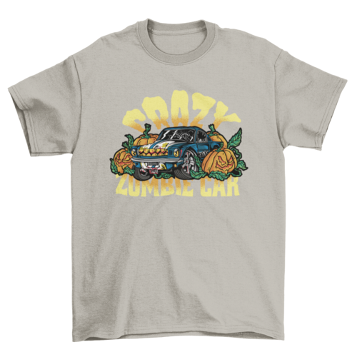 Awesome t-shirt design that features a car surrounded by jack o lanterns and the quote "Crazy zombie car".