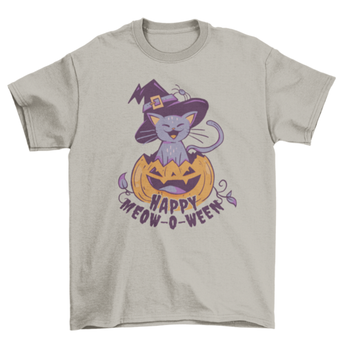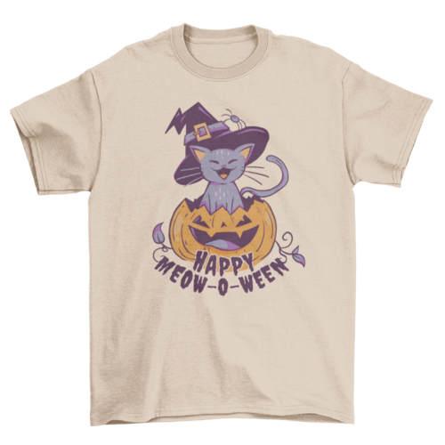Cute t-shirt design featuring a cat inside a carved Halloween pumpkin with the quote "Happy meow-o-ween".
