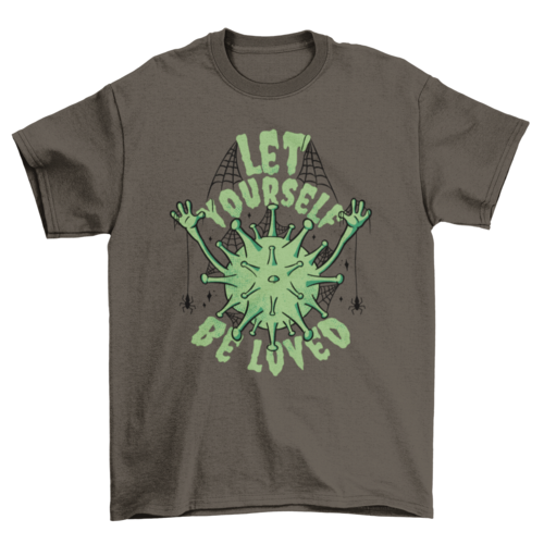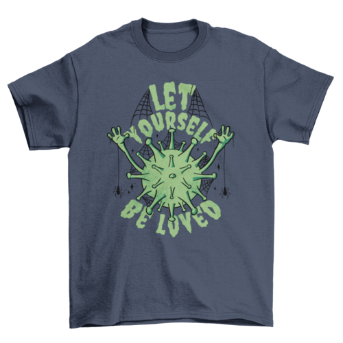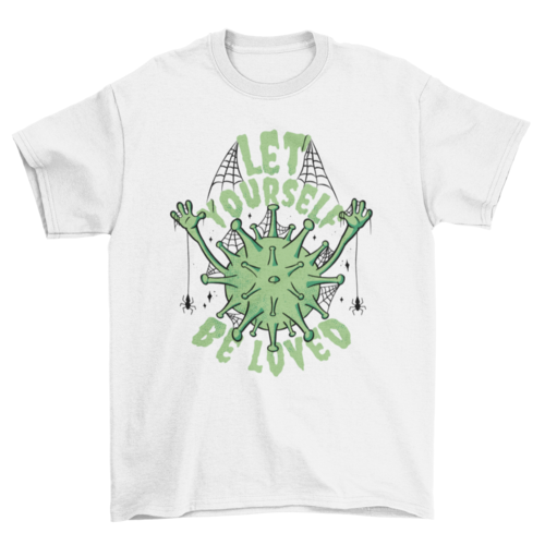 Great t-shirt design featuring a covid-19 cell with spiderwebs and the quote "Let yourself be loved". T