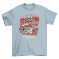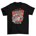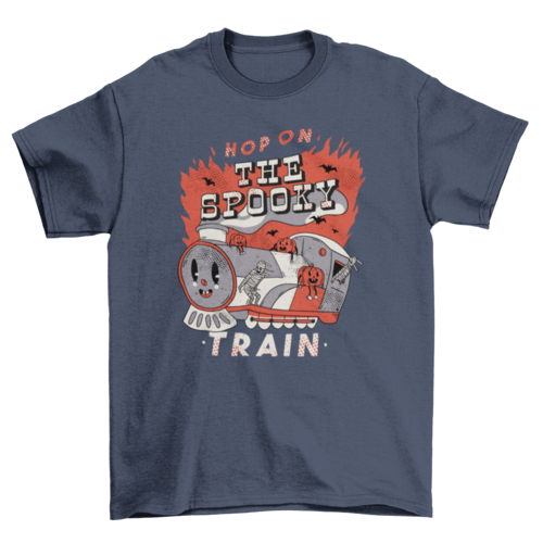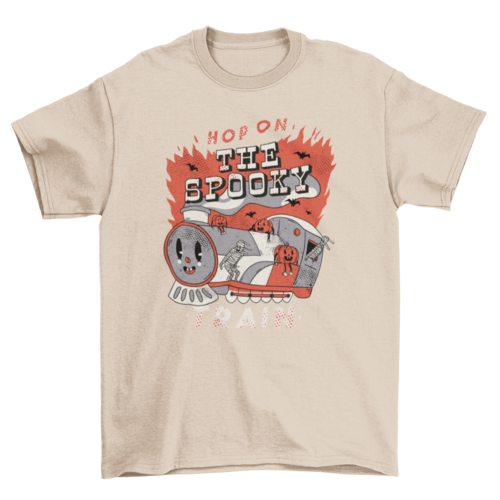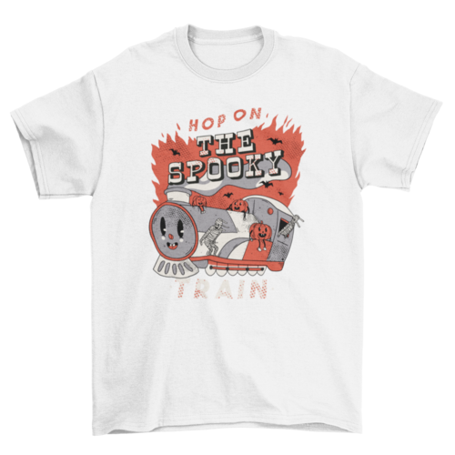 Amazing t-shirt design that features a train with monsters and the quote "Hop on the spooky train".