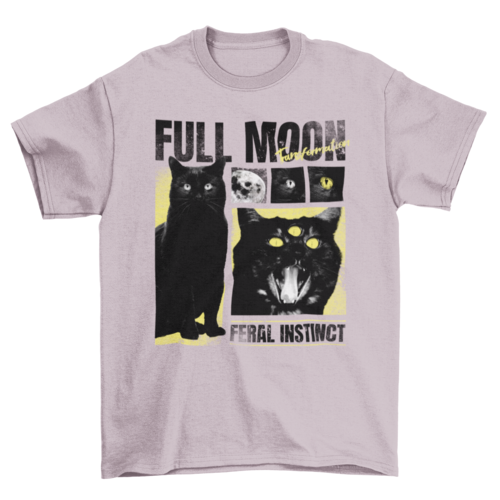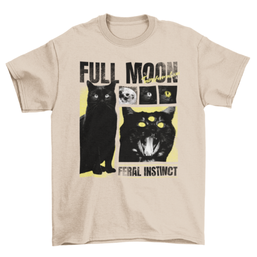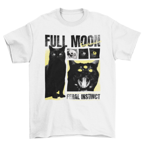 Cool t-shirt design that features a black cat with a third eye and the quote "Full moon, feral instinct".