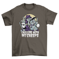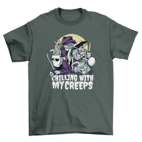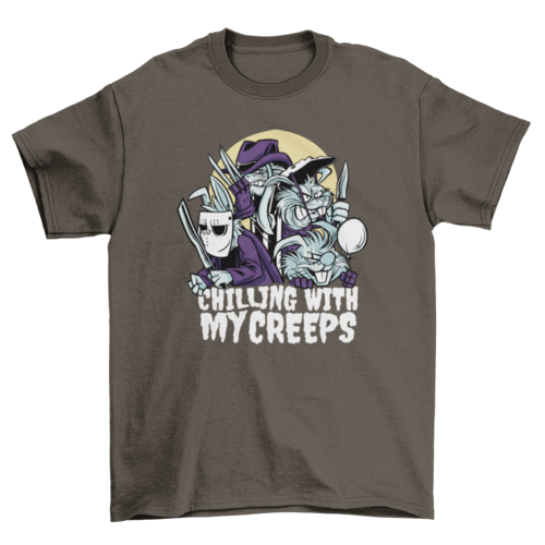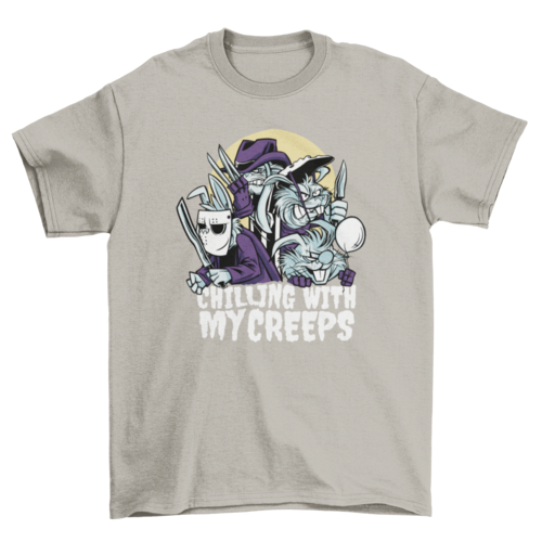Fun t-shirt design featuring four bunnies in halloween costumes with the quote "Chilling with my creeps".
