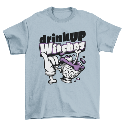 Cool t-shirt design featuring a hand holding a tea cup with eyes and bones and the quote "Drink up witches".