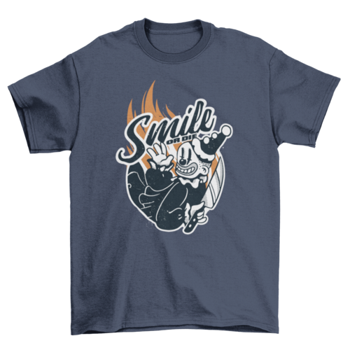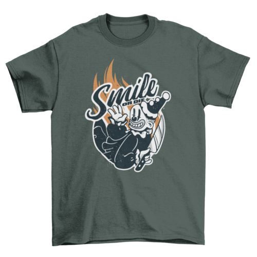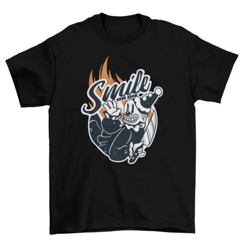 Cool t-shirt design featuring a clown holding a knife next to a quote: "Smile or die".