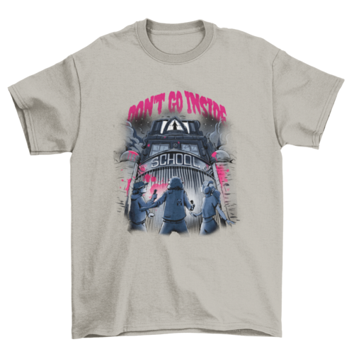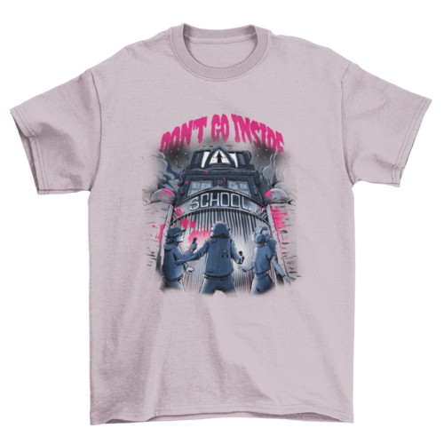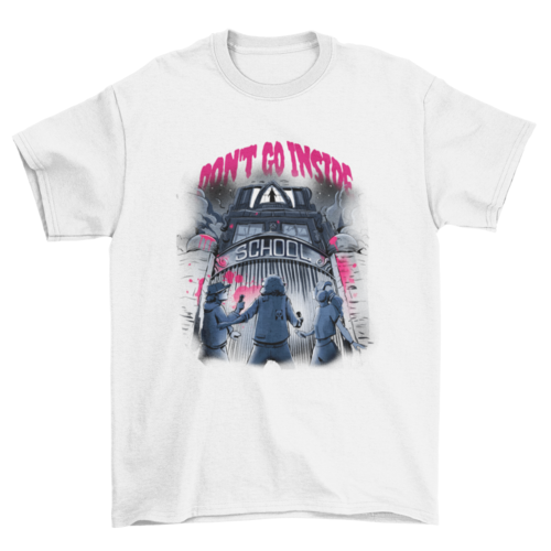 Cool t-shirt design featuring a haunted school and some kids next to a quote that reads "Don't go inside"