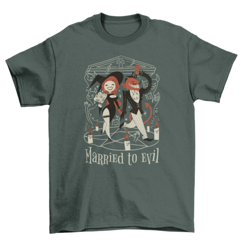 Awesome t-shirt design that features a married spooky couple and the quote "Married to evil".